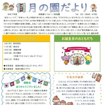 保育園では、上記の3項目を保育目標として、0歳から6歳までの保育を進めていきます。 保育目標に添ったカリキュラムを作成し、一人一人の思いを大切に受け止めながら心の通った保育を心がけていきます。